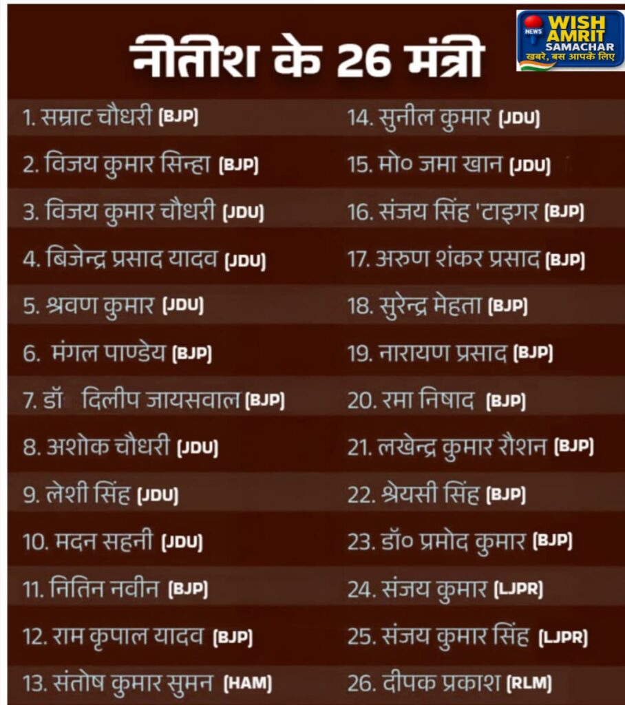 नीतीश कुमार के नेतृत्व में बनी नई सरकार में जदयू ने अपने अनुभवी मंत्रियों को बरकरार रखा है। भाजपा ने युवा चेहरों को मौका दिया है। रालोमो से उपेंद्र कुशवाहा के पुत्र दीपक प्रकाश मंत्री बने हैं, जबकि हम से संतोष सुमन ने शपथ ली। लोजपा (रा) के दो नेताओं को भी मंत्रिमंडल में शामिल किया गया है। भाजपा ने अपने पुराने नेताओं को भी जगह दी है।