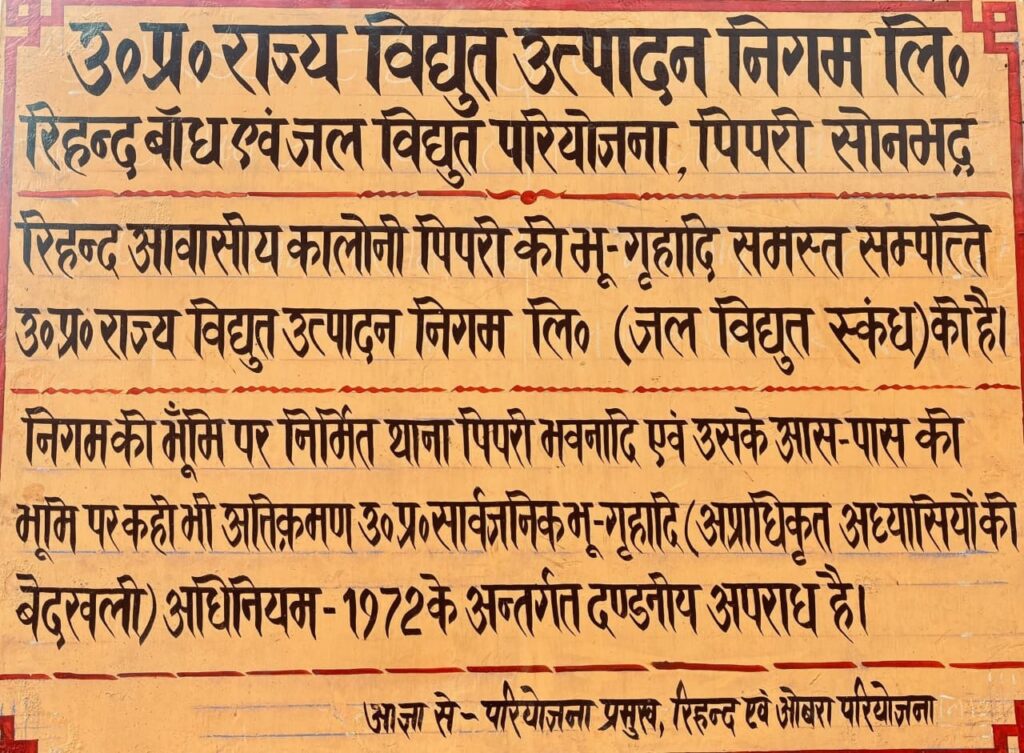 ( उत्तर प्रदेश जल विद्युत निगम लिमिटेड द्वारा पिपरी नगर के सभी सार्वजनिक स्थलों पर लगाया गया विभाग के संपत्ति का बोर्ड )