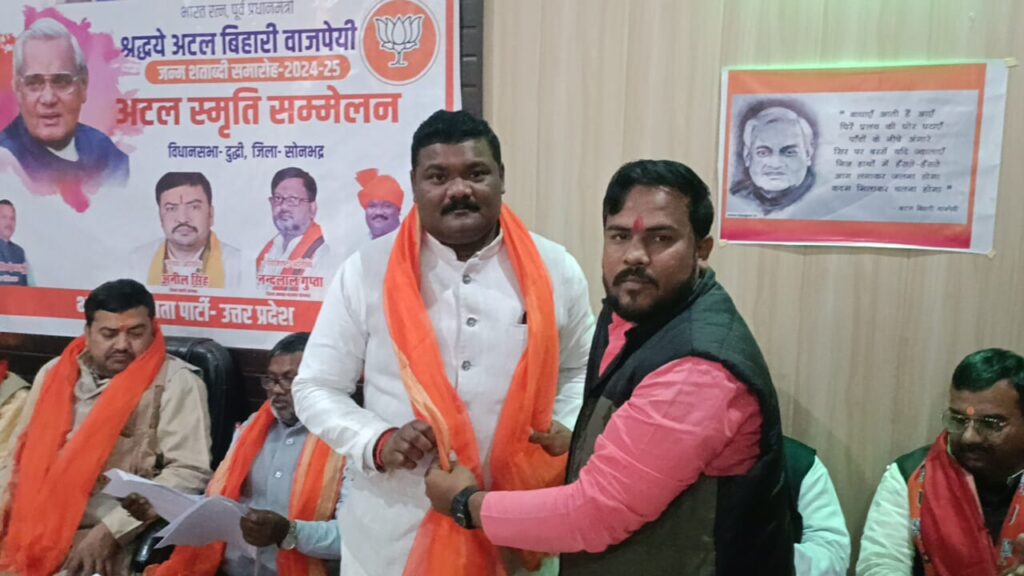 दुद्धी विधानसभा के ब्लॉक सभागार में भारतरत्न पूर्व प्रधानमंत्री अटल बिहारी वाजपेयी की शताब्दी वर्ष पर अटल स्मृति सम्मेलन का आयोजन किया गया। यह कार्यक्रम 30 दिसंबर 2025 को दोपहर लगभग 1 बजे आयोजित किया गया। मुख्य अतिथि भाजपा जिला प्रभारी अनिल सिंह विशिष्ट अतिथि जिलाध्यक्ष भाजपा नंदलाल गुप्ता व निवर्तमान दुद्धी विधानसभा प्रत्यासी श्रवण सिंह गोंड़ ने अटल बिहारी वाजपेयी श्यामा प्रसाद मुखर्जी प.दीनदयाल उपाध्याय के चित्र पर पुष्पांजलि कर वंदेमातरम गीत से सम्मेलन का शुभारंभ किया।नगर पंचायत चेयरमैन कमलेश मोहन ने कार्यक्रम का प्रस्तावना अभिवादन भाषण दिया। इस दौरान सम्मेलन को संबोधित करते हुए मुख्यातिथि अनिल सिंह ने पूर्व प्रधानमंत्री अटल बिहारी वाजपेयी के जीवन परिचय पर प्रकाश डाला। उन्होंने वाजपेयी जी के संघर्ष, त्याग और राष्ट्र के प्रति समर्पण को याद दिलाया।