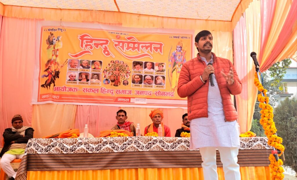 सोनभद्र। सकल हिंदू समाज द्वारा चतरा के बभनगावा मंडल अंतर्गत उमाशंकर सिंह इंटर कालेज के प्रांगण में सोमवार को हिन्दू सम्मेलन का आयोजन किया गया। हिन्दू सम्मेलन को सम्बोधित करते हुये मुख्य वक्ता राहुल ने कहा की हिंदू समाज का संगठन इसलिए महत्वपूर्ण है की भारतीय संस्कृति की श्रेष्ठता, और राष्ट्र निर्माण में हिंदुओं की भूमिका सनातन धर्म के सिद्धांतों को निभाते हुये अत्यंत सुखद रहा है। जिसके परिणाम स्वरूप पुरातन काल से लेकर आज तक भारत विश्व गुरु कहलाता रहा है जिसमें एकता, मजबूत सुरक्षा, और देश के सर्वांगीण विकास (शिक्षा, ईमानदारी, प्रगति) के लिए ‘हिंदू’ की व्यापक परिभाषा (जो भारत में रहता है,वह सब हिंदू है) पर अब बात होनी चाहिए। साथ ही ‘कृति से सिद्धि’ (सिर्फ भाषण नहीं, कर्म) का आह्वान संघ ने अपने सौ वर्षो में किया है।