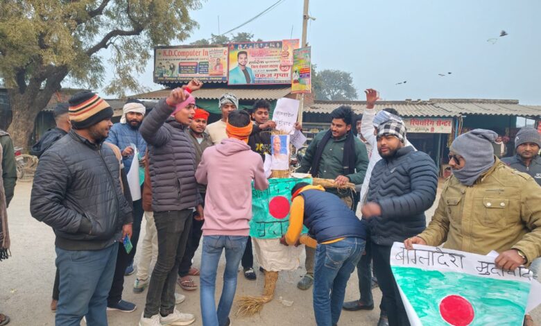 मड़ियाहूं तहसील क्षेत्र के रामनगर में शनिवार शाम को यूनुस खान का पुतला फूंका गया। यह प्रदर्शन बांग्लादेश में एक हिंदू युवक की नृशंस हत्या और वहां हिंदू समुदाय के प्रति हो रहे व्यवहार के विरोध में किया गया।