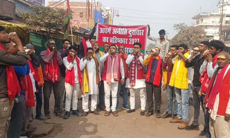 सपा कार्यकर्ताओं ने 27 शंख बजाकर महंगाई व बेरोज़गारी के खिलाफ किया प्रदर्शन