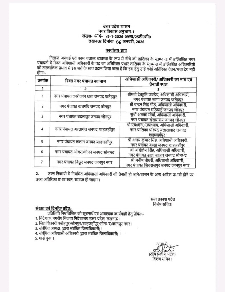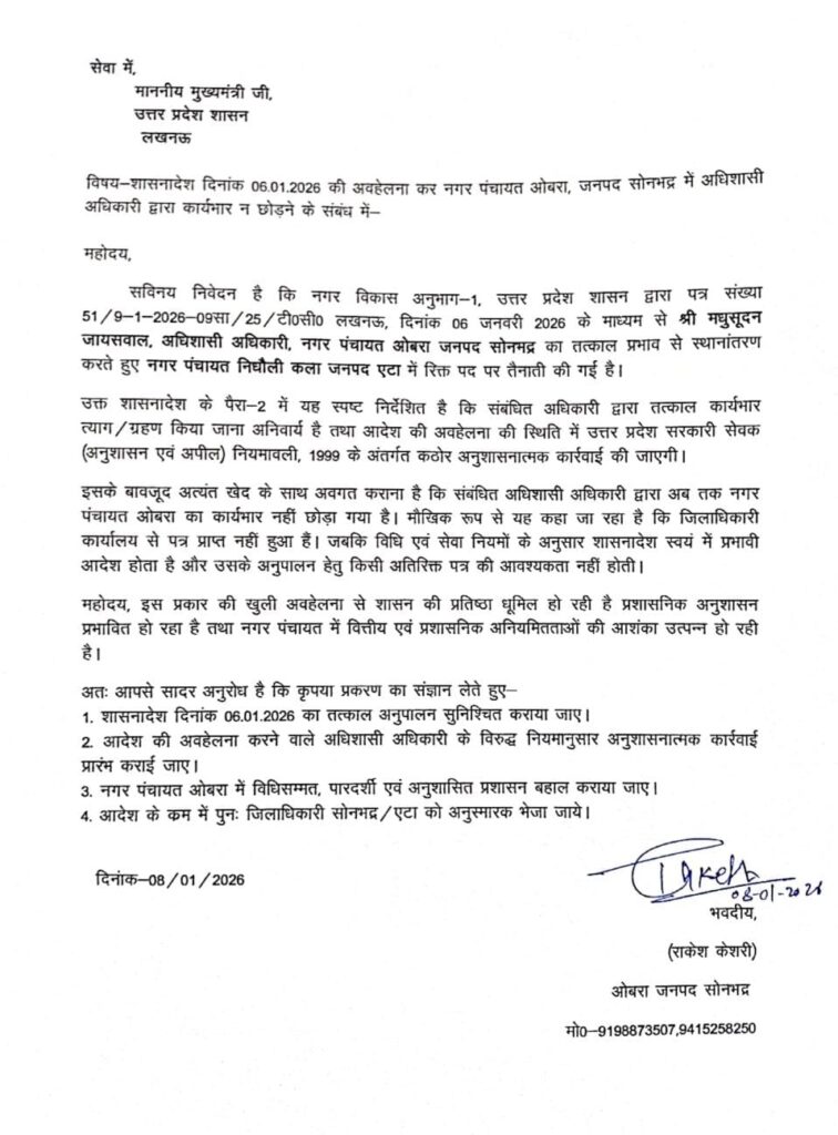सोनभद्र। उत्तर प्रदेश शासन द्वारा 6 जनवरी 2026 को जारी शासनादेश की खुलेआम अवहेलना का मामला सामने आया है। नगर पंचायत ओबरा जनपद सोनभद्र के अधिशासी अधिकारी मधुसूदन जायसवाल का शासनादेश के माध्यम से तत्काल प्रभाव से स्थानांतरण कर नगर पंचायत निधौली कला, जनपद एटा में तैनाती कर दी गई थी, इसके बावजूद उन्होंने अब तक ओबरा नगर पंचायत का कार्यभार नहीं छोड़ा है।नगर विकास अनुभाग-1, उत्तर प्रदेश शासन द्वारा जारी पत्र संख्या 51/9-1-2026-09सा/25/टी0सी0, दिनांक 06 जनवरी 2026 में स्पष्ट निर्देश है कि संबंधित अधिकारी को तत्काल कार्यभार त्याग/ग्रहण करना होगा। आदेश के पैरा-2 में यह भी उल्लेख है कि आदेश की अवहेलना की स्थिति में उत्तर प्रदेश सरकारी सेवक (अनुशासन एवं अपील) नियमावली, 1999 के अंतर्गत कठोर अनुशासनात्मक कार्रवाई की जाएगी।