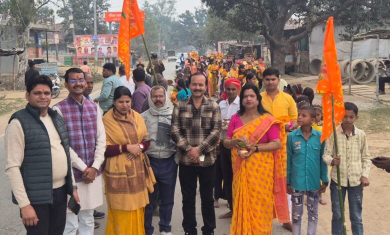 सोनभद्र :- रावर्ट्सगंज ब्लॉक चुर्क स्थित के सहिजन में चंद्रिका माता मंदिर परिसर में सोमवार को सात दिवसीय श्रीरामकथा के आयोजन का शुभारंभ भव्य कलश यात्रा के साथ हुआ, जिसमें बड़ी संख्या में श्रद्धालुओं ने उत्साहपूर्वक भाग लिया।इस कलश यात्रा में महिलाओं ने सिर पर कलश धारण कर भक्ति भाव से शोभायात्रा में सहभागिता की। यात्रा में भगवान श्रीराम एवं गोस्वामी तुलसीदास जी की आकर्षक झांकियां भी शामिल रहीं। कलश यात्रा चंद्रिका माता मंदिर से प्रारंभ होकर सहिजन कलां, सहिजन खुर्द मोहाल होते हुए पुनः चंद्रिका माता मंदिर परिसर में संपन्न हुई। कलश यात्रा के दौरान श्रद्धालु भगवान के भजनों पर झूमते-गाते हुए अबीर-गुलाल उड़ाते नजर आए। श्रीराम के जयकारों से संपूर्ण वातावरण भक्तिमय हो गया।