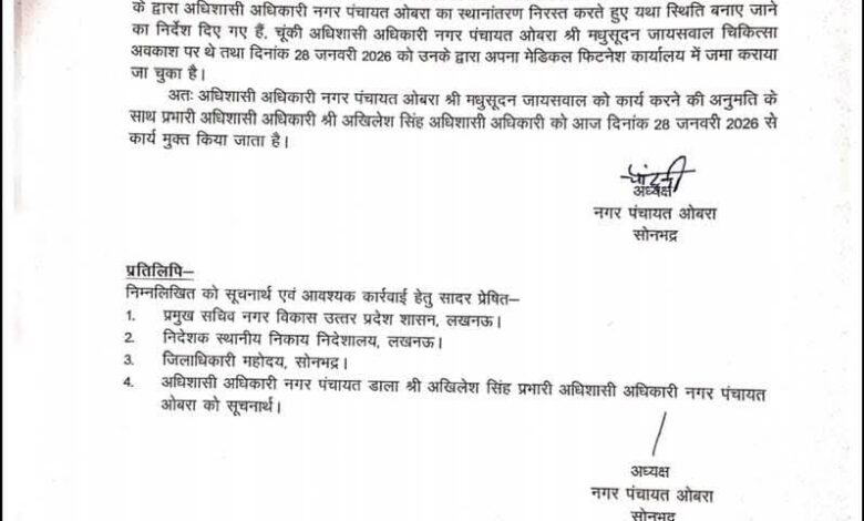 ओबरा सोनभद्र ताजा मामला ओबरा नगर पंचायत का है कुछ दिन पहले अधिशाषी अधिकारी ओबरा (श्री मधुसूदन जायसवाल )जी का स्थानांतरण हुआ था और उनके स्थान पर डाला नगर पंचायत के अधिशासी अधिकारी को ओबरा नगर पंचायत का अतिरिक्त कार्य भार सोपा गया था कुछ दिनों बाद अध्यक्ष नगर पंचायत ओबरा द्वारा एक चिट्ठी जारी की जाती है और यह बताया जाता है कि अधिशासी अधिकारी नगर पंचायत ओबरा श्री मधुसूदन जयसवाल जी मेडिकल छुट्टी लिए हुए थे और उनकी जॉइनिंग नगर पंचायत अध्यक्ष ओबरा द्वारा करा दिया जाता है सोचने वाली बात है कि एक राजपत्रित अधिकारी की जॉइनिंग जनता द्वारा चुने गए नगर पंचायत अध्यक्ष द्वारा कराया जाता है जबकि उनके स्थानांतरण की जानकारी नगर विकास अनुभाग द्वारा जारी की जाती है लेकिन उनके जॉइनिंग की जानकारी नगर विकास अनुभाग के द्वारा नहीं दी जाती है यह जानकारी नगर पंचायत अध्यक्ष के द्वारा जारी की जाती है