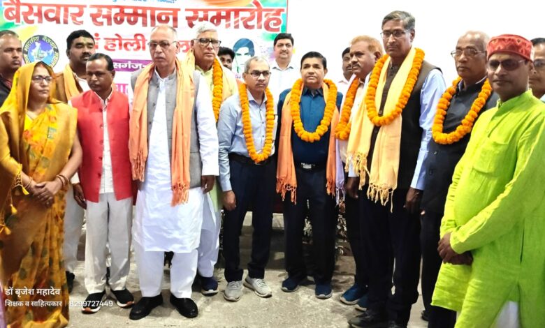 डॉ बृजेश महादेव -राष्ट्रीय संयोजक, बैसवार कल्याण समिति के साथ एक दर्जन बंधु हुए सम्मानित ! प्रथम बैसवार सम्मान समारोह एवं महासंघ होली मिलन संम्पन्न – सोनभद्र बैसवार समाज के सेवानिवृत्ति अधिकारियों, शिक्षकों एवं कर्मचारियों का सम्मान समारोह धुमधाम से सम्पन्न हुआ। जिसमें सत्ताईस लोगों को सम्मानित किया गया। सर्वश्री ई श्याम सुन्दर सिंह ग्राम नेवारी सोनभद्र, भगवान दास बैस ग्राम नौगढ सिंगरौली,ई श्याम लाल सिंह ग्राम केवटा सोनभद्र,ई उमराव लाल सिंह ग्राम सिल्पी सोनभद्र,ई केवला प्रसाद सिंह ग्राम पड़वनिया सोनभद्र,ई राम नरेश सिंह ग्राम केवटा सोनभद्र, ई लालता प्रसाद ग्राम केवटा सोनभद्र सहित सत्ताईस लोगों को सम्मानित किया गया। विशिष्ट सम्मान के रूप में डॉ बृजेश महादेव शिक्षक एवं साहित्यकार, डॉ श्रीराम सिंह श्रीराम हास्पिटल, डॉ अरुण सिंह लाल बाल चिकित्सालय, विमला देवी प्रधानाचार्या राजकीय कगावि , डॉ जितेन्द्र सिंह, डॉ अखिलेश सिंह, डॉ राहुल सिंह, डॉ विरेंद्र सिंह, डॉ अरविन्द सिंह, ब्रिजानंद सिंह,ई रामेश्वर सिंह, कन्हैयालाल सिंह रीडर जिलाधिकारी कार्यालय, रवि प्रताप सिंह, ई ब्रिजमोहन सिंह, ई संजय सिंह, ई यज्ञनारायण सिंह, राजेंद्र प्रसाद सिंह प्रबंधक, ब्रजेश सिंह डायरेक्टर लक्ष्य ग्रुप आफ कालेज, सीता कुमारी छात्रा को सम्मानित किया गया।