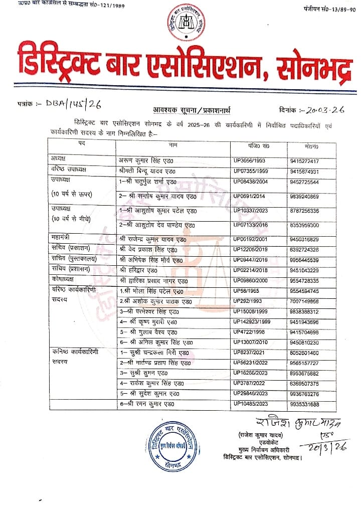 निर्विरोध चुने गए अरुण कुमार सिंह अध्यक्ष, राजेंद्र कुमार यादव महामंत्री – डिस्ट्रिक्ट बार एसोसिएशन सोनभद्र के सत्र 2025-2026 के पदाधिकारी व कार्यकारिणी निर्विरोध घोषित – पदाधिकारियों व कार्यकारिणी सदस्यों को पद एवं गोपनीयता की दिलाई गई शपथनिर्विरोध चुने गए अरुण कुमार सिंह अध्यक्ष, राजेंद्र कुमार यादव महामंत्री