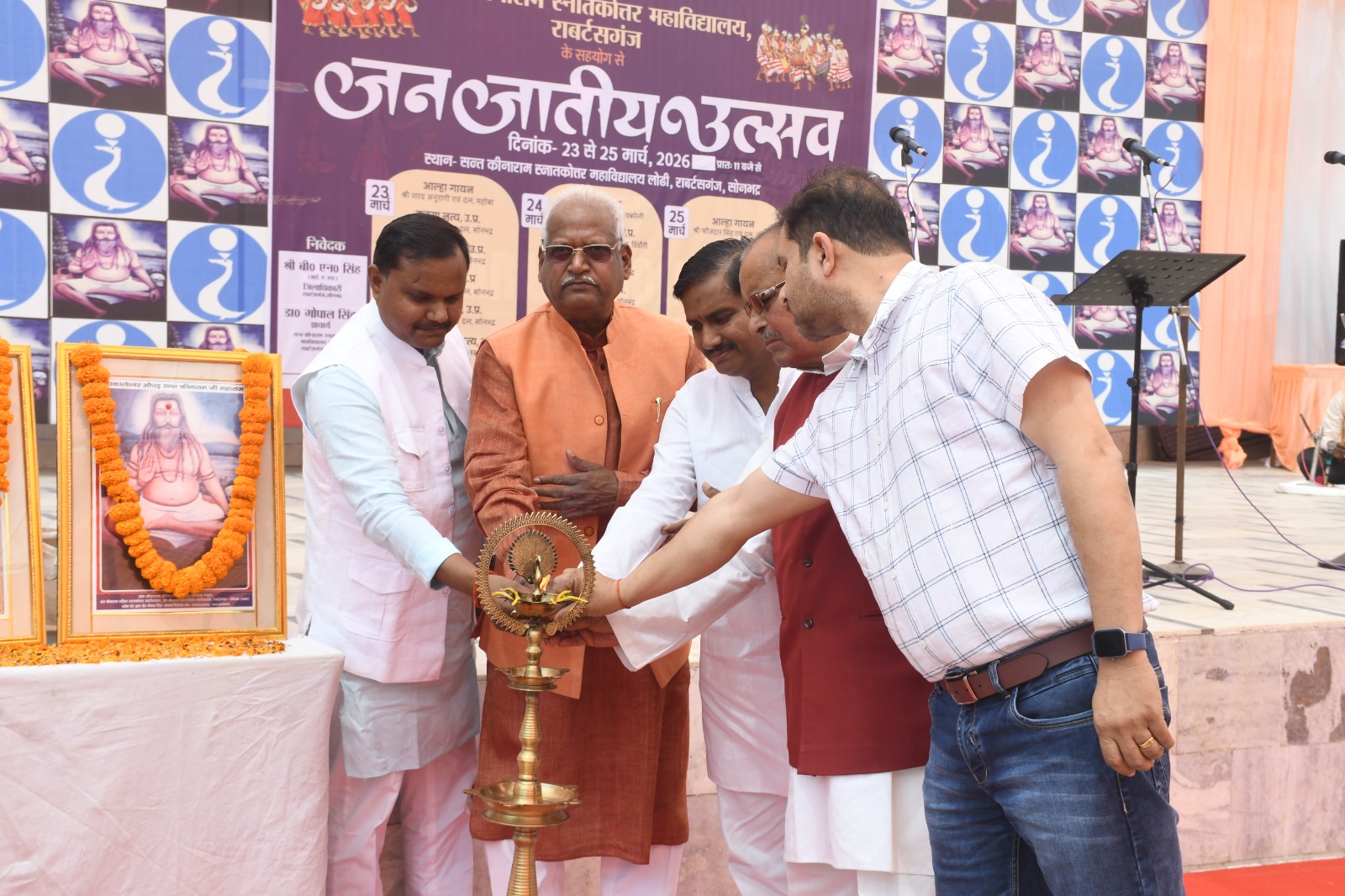 सोनभद्र। जिला मुख्यालय लोढ़ी, सोनभद्र स्थित संत कीनाराम स्नातकोत्तर महाविद्यालय परिसर में तीन दिवसीय जन जातीय उत्सव का आगाज सोमवार से शुरू हो गया। इसमें तीन प्रांतों उत्तर प्रदेश, मध्यप्रदेश व राजस्थान के कलाकारों ने अपना दमखम दिखाया। कार्यक्रम का शुभारंभ मुख्य अतिथि वरिष्ठ समाजसेवी राम सकल चौबे, कार्यक्रम संयोजक एवं प्राचार्य डॉक्टर गोपाल सिंह, विशिष्ट अतिथि शमशेर बहादुर सिंह जिला मंत्री राष्ट्रीय ग्राम प्रधान संघ, मोहन कुशवाहा जिला पंचायत सदस्य, बलवंत सिंह प्रबंधक, राजेश कुमार मिश्रा प्रबंधक, वरिष्ठ कांग्रेस नेता राजेश द्विवेदी, नार सिंह पटेल, डॉक्टर अशोक मिश्रा के द्वारा दिप प्रज्ज्वलित कर किया गया।
