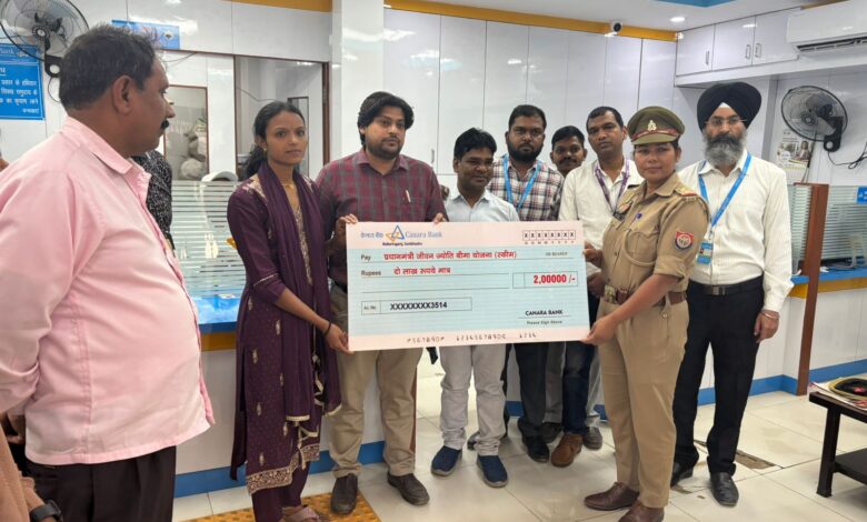 सोनभद्र। राबर्ट्सगंज नगर स्थित केनरा बैंक ने शुक्रवार को मृतक आश्रित परिवार के सदस्यों को प्रधानमंत्री जीवन ज्योति बीमा योजना के तहत महिला थाना प्रभारी सविता सरोज व शाखा प्रबन्धक आरिफ अब्बास के द्वारा मृतक आश्रित के परिवार को दो लाख का चेक दिया गया।