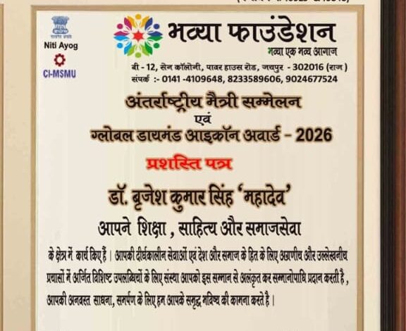 सोनभद्र। जिले के चोपन ब्लॉक अंतर्गत ग्राम पंचायत भरहरी के नवाचारी शिक्षक एवं साहित्यकार डॉ. बृजेश कुमार सिंह “महादेव” को भव्या फाउंडेशन के तत्वाधान में आयोजित अंतर्राष्ट्रीय मैत्री सम्मेलन में “ग्लोबल डायमंड आइकन अवार्ड–2026” से सम्मानित किया गया। यह भव्य समारोह जयपुर स्थित सुरेश ज्ञान विहार यूनिवर्सिटी के कालिंदी ऑडिटोरियम में 5 अप्रैल को आयोजित हुआ, जिसमें 15 देशों सहित लगभग 200 विशिष्ट प्रतिभाओं को सम्मानित किया गया। डॉ. बृजेश महादेव वर्तमान में बेसिक शिक्षा विभाग के अंतर्गत संचालित पीएम श्री कंपोजिट विद्यालय पल्हारी, नगवां (सोनभद्र) में वरिष्ठ शिक्षक एवं ब्लॉक स्काउट मास्टर के रूप में कार्यरत हैं। उन्हें यह सम्मान शिक्षा, साहित्य एवं समाजसेवा के क्षेत्र में उनके दीर्घकालीन योगदान और उत्कृष्ट उपलब्धियों के लिए प्रदान किया गया।