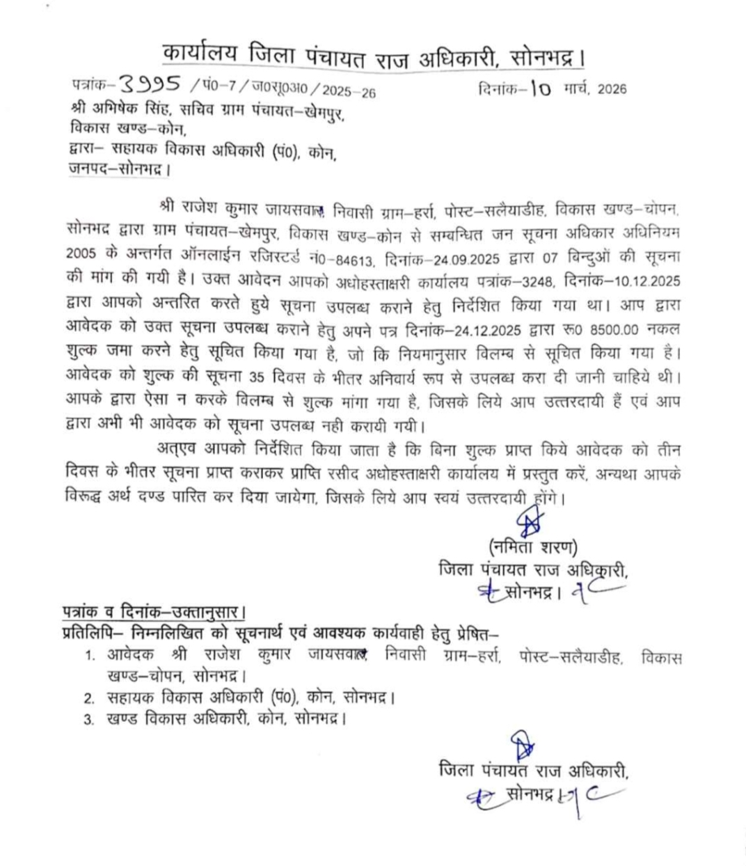करीब 35 दिन बाद संबंधित विभाग द्वारा आवेदक से ₹8500 का नकल शुल्क मांगा गया। हैरानी की बात यह रही कि इस शुल्क के साथ न तो कुल पृष्ठों की संख्या स्पष्ट की गई और न ही शुल्क निर्धारण का कोई आधार बताया गया।शिकायतकर्ता का आरोप है कि यदि ₹2 प्रति पृष्ठ के मानक के अनुसार गणना की जाए, तो ₹8500 के बदले लगभग 4250 पृष्ठों की जानकारी उपलब्ध कराई जानी चाहिए थी। डीपीआरओ सोनभद्र के आदेश के बाद आवेदक को मात्र 646 पृष्ठ ही उपलब्ध कराए गए। इनमें भी कई दस्तावेज धुंधले, अपठनीय और अधूरे पाए गए। इस प्रकार लगभग 3600 से अधिक पृष्ठों की जानकारी गायब पाई गई, जिससे पूरे मामले पर संदेह गहरा गया है।इस प्रकरण में जिला पंचायत राज अधिकारी ने स्वयं माना कि शुल्क की मांग नियमों के विरुद्ध थी। उन्होंने आदेश जारी करते हुए निर्देश दिया कि आवेदक को बिना किसी शुल्क के 3 दिनों के भीतर पूरी जानकारी उपलब्ध कराई जाए। साथ ही चेतावनी दी गई कि आदेश का पालन न करने पर ₹250 प्रतिदिन (अधिकतम ₹25000) का जुर्माना लगाया जाएगा। इस पूरे घटनाक्रम ने कई अहम प्रश्न खड़े कर दिए हैं— ₹8500 का शुल्क किस आधार पर निर्धारित किया गया?, 4250 पृष्ठों का दावा कहां गया?,-केवल 646 पृष्ठों में ही पूरी जानकारी क्यों सीमित रही?क्या शेष दस्तावेज जानबूझकर छिपाए जा रहे हैं?, क्या यह किसी बड़े वित्तीय घोटाले को दबाने की कोशिश है?